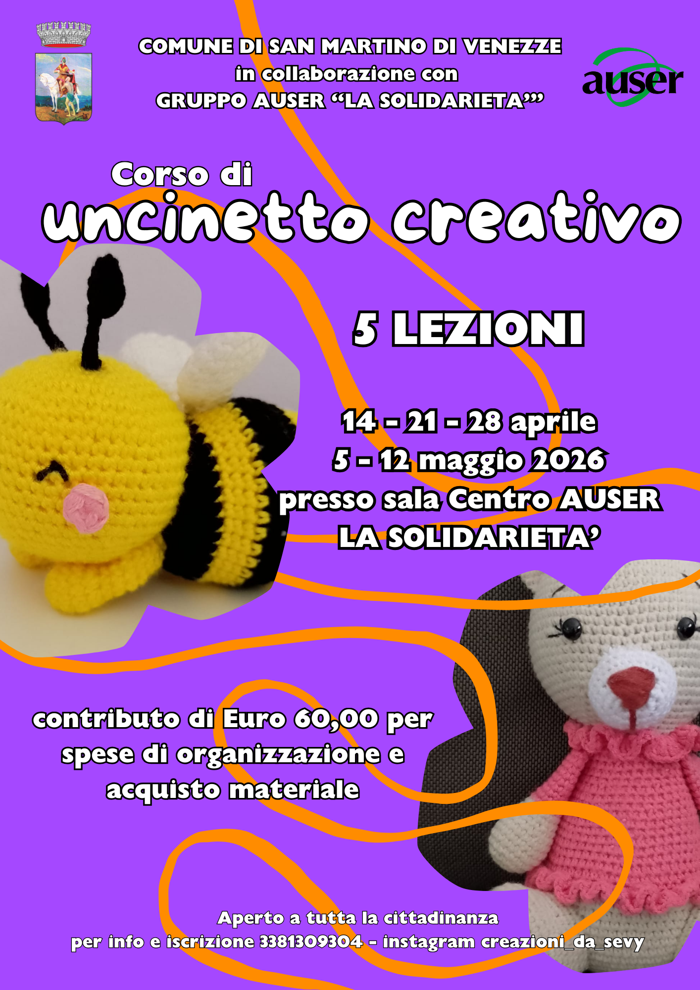 Il Comune di San Martino di Venezze, in collaborazione con il Gruppo AUSER "La Solidarietà", promuove un CORSO DI UNCINETTO CREATIVO, articolato in 5 lezioni a partire dal 14 aprile 2026. Il corso si svolge presso i locali del Centro Auser di piazzetta Nassirya a San Martino di Venezze